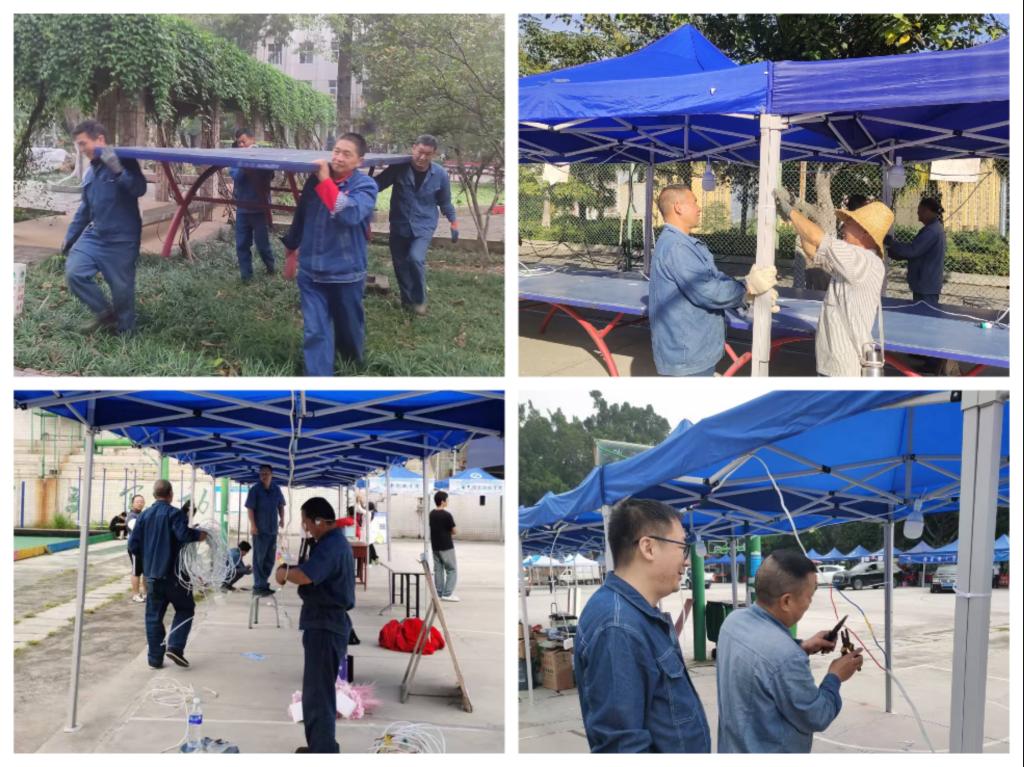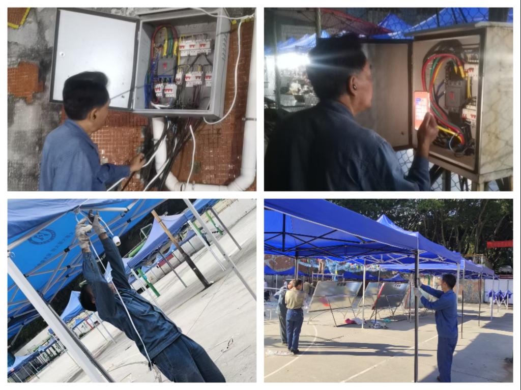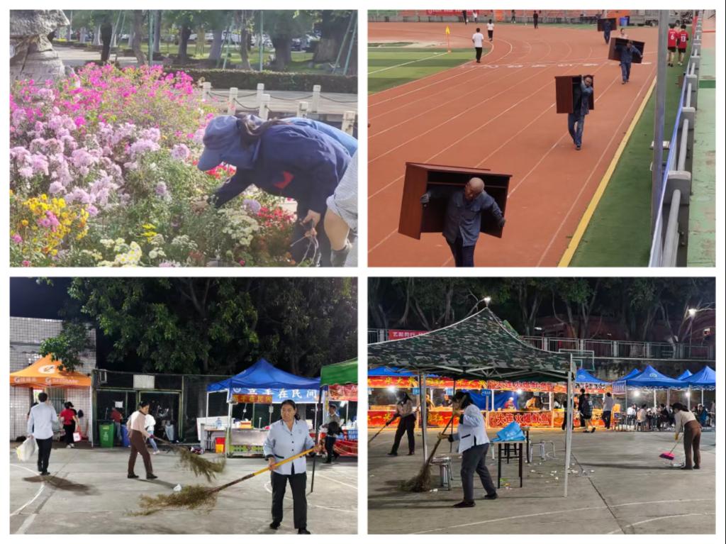 活动前期,公司领导提前谋划、精心部署,从人员配置、场地布置、物资供应、应急处置等多方面发力,以专业高效的服务为校运社团美食文化活动节筑牢“服务保障防线”。环境服务中心工作人员快速完成活动场地卫生清理、物资搬运、帐篷搭建、桌椅摆放等基础工作;维修服务中心水电技术人员对相关区域的电路进行了专项检查,并在活动场地拉起专线,用于满足摊位临时用电需求,确保夜间照明及活动用电万无一失。