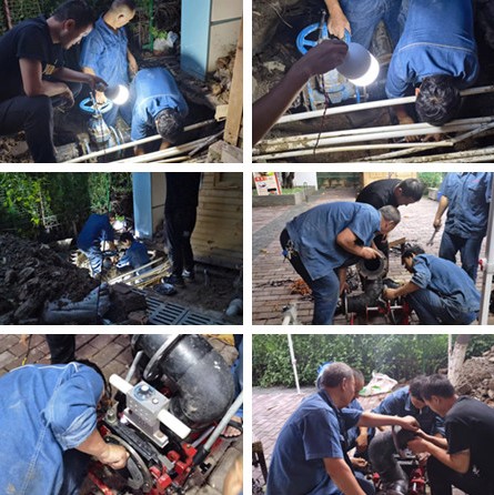 6月28日早7时许,位于西苑校区学生食堂右侧挡墙处自来水喷涌不止,接报后,公司维修部人员第一时间赶赴现场。经排查发现系主供水管爆裂所致,遂立即关闸止水,组织人员对该区域进行人工开挖,抢修人员轮番作业,半蹲着进行割管、熔接、上螺丝,历经10多个小时,于当日晚间9时许抢修完毕,恢复正常供水。
