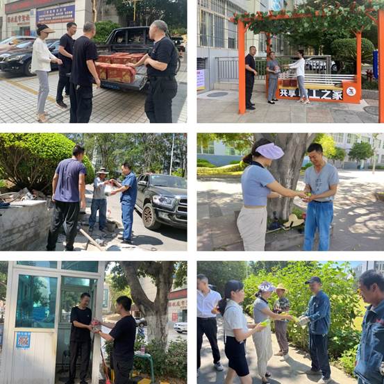 酷暑难当,关怀难挡。连日来,我市气温居高不下,给学校环境绿化、卫生保洁、维修等服务工作带来了严峻考验。为认真做好高温天气防暑降温工作,激发调动工作在一线的员工积极性,5月31日上午,公司工会、品质监察部、环境服务中心、维修服务中心、安信物业分别走访慰问了在校园以及学府广场小区战高温、斗酷暑坚守岗位的一线员工,为他们送去饮料、西瓜等防暑降温慰问品,将公司的关怀与关爱送至每一位一线员工心中,对他们高温下的坚守和辛勤付出表示感谢,并暖心叮嘱大家在高温天气下注意防暑降温,劳逸结合,确保自身安全健康,同时希望大家持续强化责任担当,永葆本色,在平凡的岗位上做出不平凡的业绩。