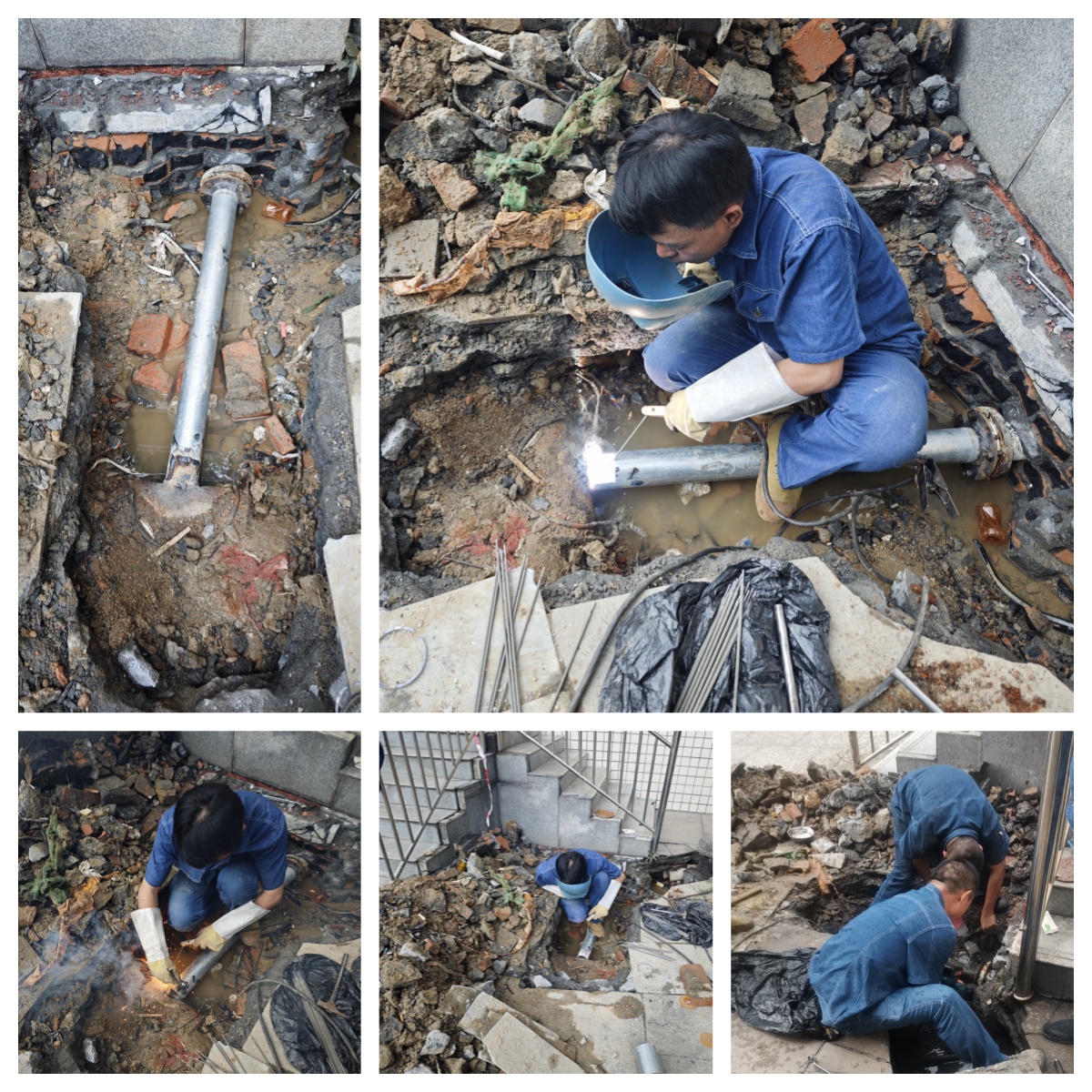 为最大限度降低停水给广大师生带来的不便,维修人员不惧烈日于正午时分迅速投入到紧张的抢修工作中。在开挖的泥坑内,尽管泥水浸润了他们的双脚,汗水湿透了他们的衣背,但大家毫不退缩以最快速度完成路面开挖,漏点查找,管道更换与焊接等工序,顺利完成抢修工作,恢复供水。